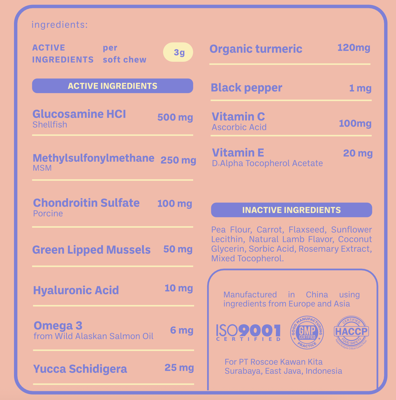 Suplemen yang diformulasikan khusus untuk menjaga kesehatan sendi dan mobilitas anabul kesayangan anda.Mengandung Glucosamine, MSM, Chondroitin, Omega-3 dari minyak Salmon Liar Alaska, Kunyit Organik, Vitamin C & E, serta Green Lipped Mussels yang dikenal kaya nutrisi untuk mendukung kesehatan sendi, membantu meredakan nyeri & peradangan, serta menjaga mobilitas anabul tetap aktif setiap hari. Bentuk soft chew dengan rasa domba membuatnya mudah diberikan mudah diberikan tanpa paksaan karena terasa seperti snack lezat untuk anabul.